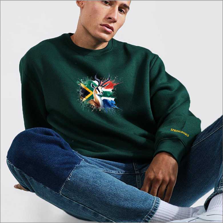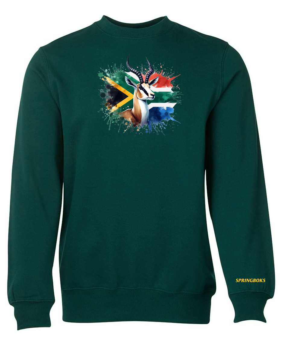 Beautiful vibrant bottle green sweatshirt with Springbok and South African flag print